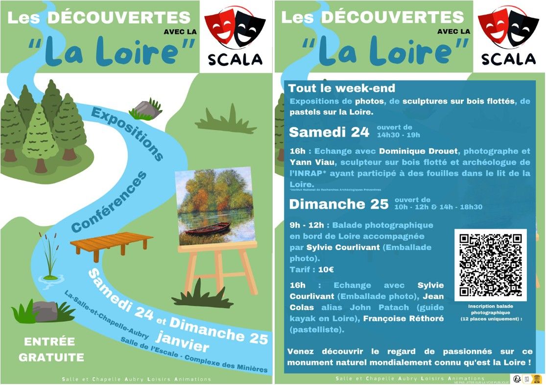 Les 24 et 25 janvier prochain, découvrez la Loire à travers le regard d’artistes et d’invités passionnants et passionnés, lors du week-end découverte de la SCALA. Au programme, expositions de photographies, de sculptures sur bois flotté, de pastels sur la Loire, mais aussi balade photographique en bord de Loire, grâce à cinq invités amoureux du plus long fleuve de France. Venez échanger avec Dominique DROUET, photographe incontournable des Mauges, Sylvie COURLIVANT, organisatrice de balades photographiques, Yann VIAU, sculpteur sur bois flottés et archéologue pour l’INRAP, Jean COLAS, guide kayak en Loire, et Françoise RÉTHORÉ, pastelliste. De beaux moments d’échanges et de découvertes en perspective !